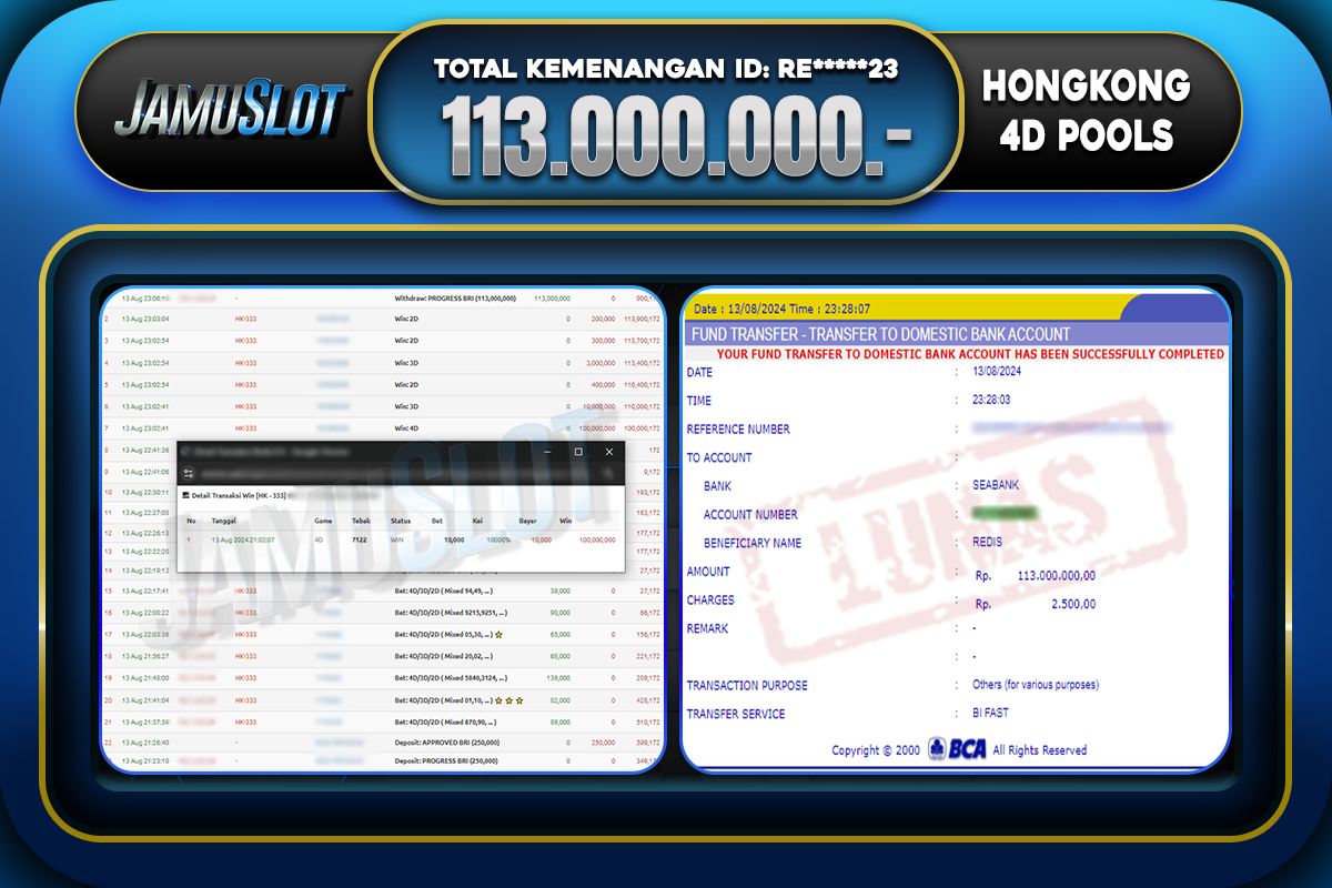 Bukti JP HONGKONG 4D POOLS Di Bayar LUNAS Situs JamuSlot Amanah Sebesar Rp.113.000.000,-
