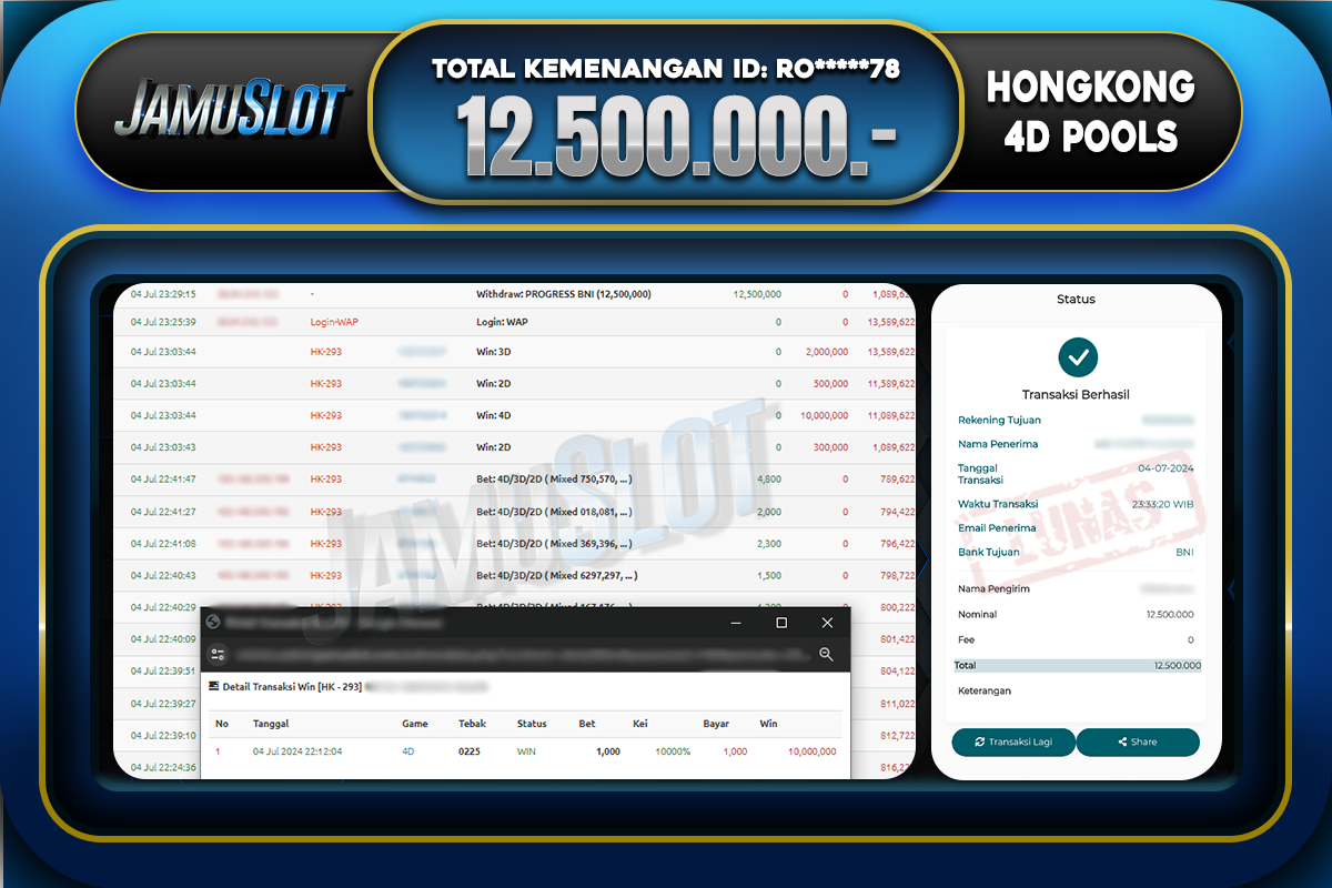 Bukti JP HONGKONG 4D POOLS Di Bayar LUNAS Situs JamuSlot Amanah Sebesar Rp.12.500.000,-