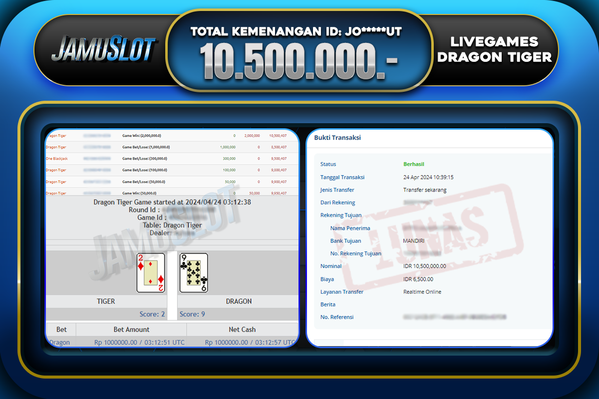 Bukti JP LIVE GAMES DRAGON TIGER Di Bayar LUNAS Situs JamuSlot Amanah Sebesar Rp.10.500.000,-