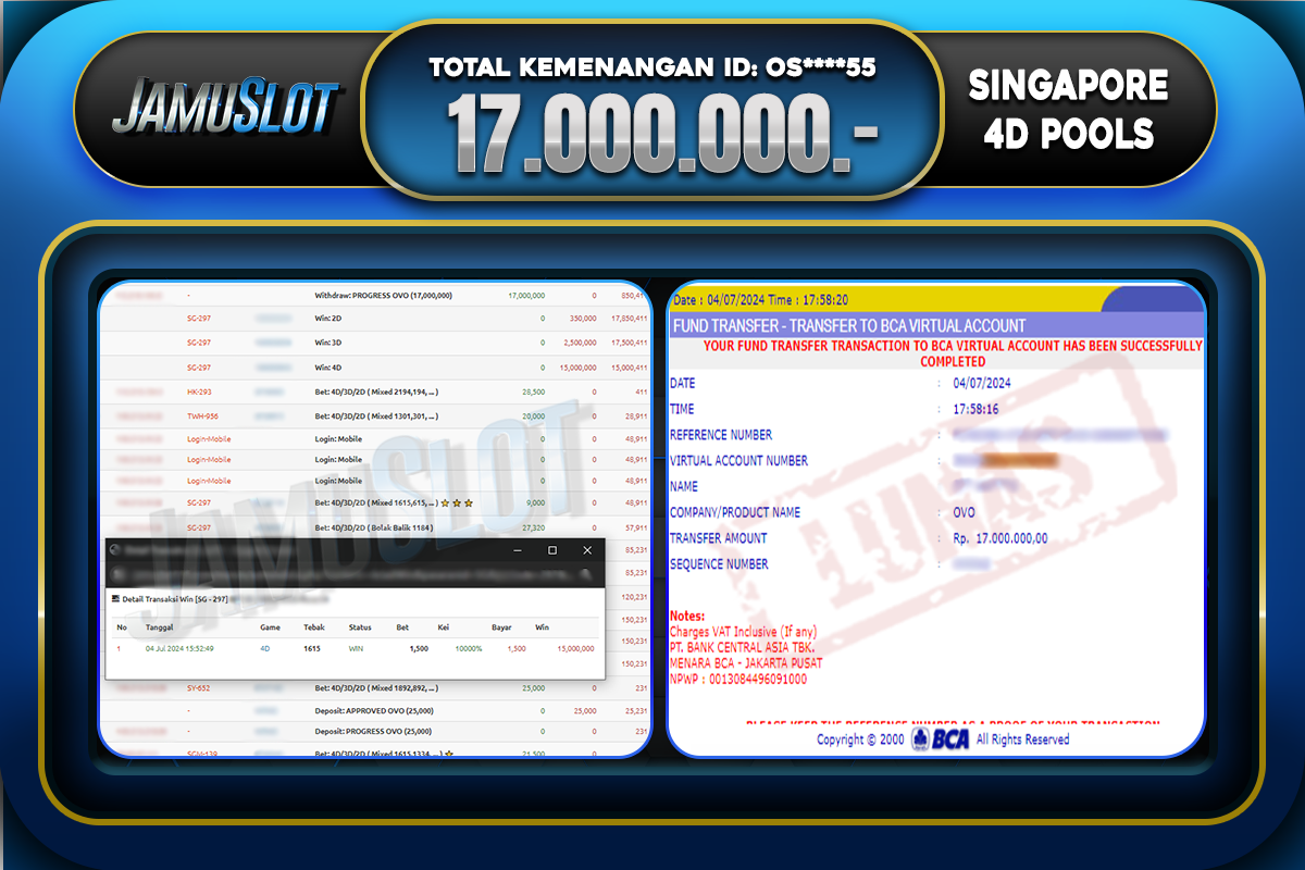 Bukti JP SINGAPORE 4D POOLS Di Bayar LUNAS Situs JamuSlot Amanah Sebesar Rp.17.000.000,-