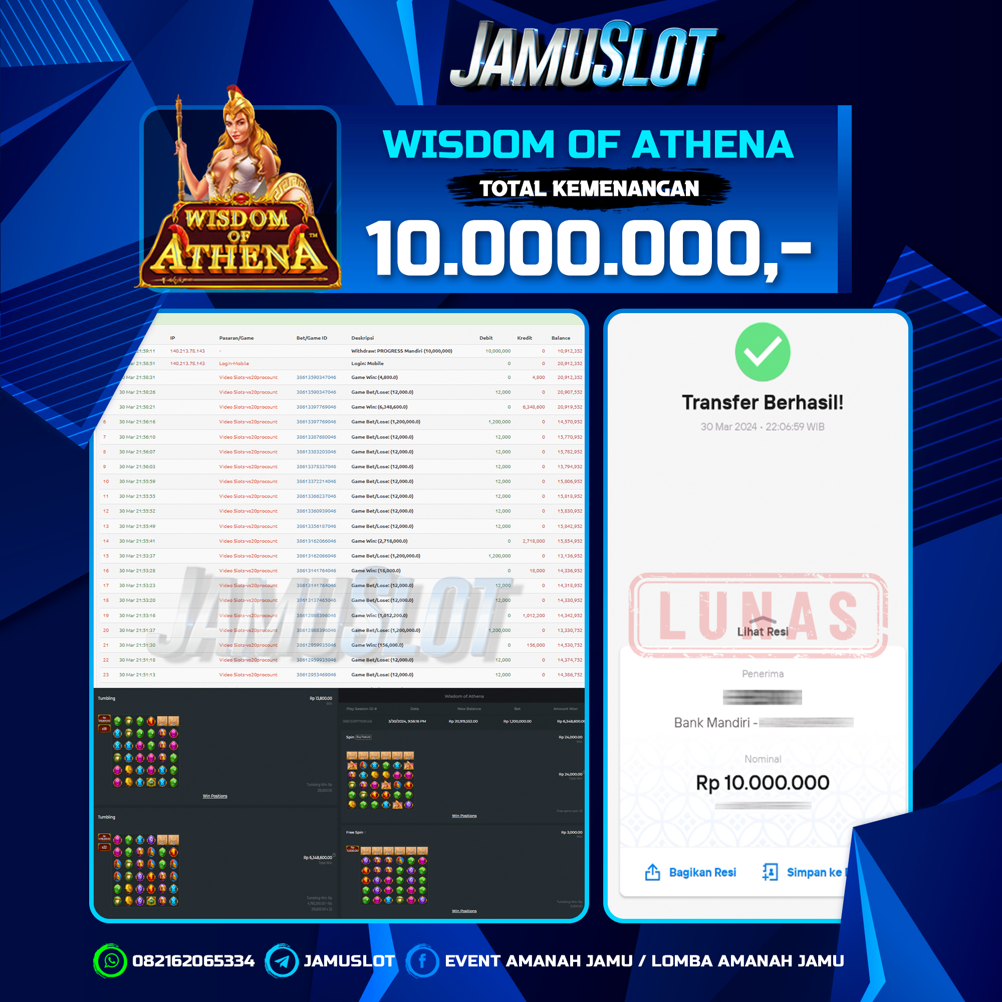 Bukti JP SLOT WISDOM OF ATHENA Di Bayar LUNAS Situs JamuSlot Amanah Sebesar Rp.10.000.000,-