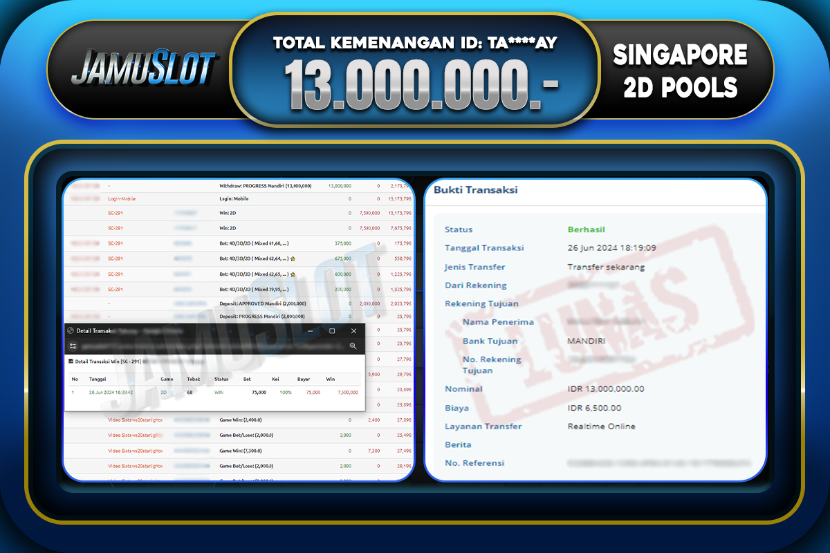 Bukti JP TOGEL SINGAPORE 2D POOLS Di Bayar LUNAS Situs JamuSlot Amanah Sebesar Rp.13.000.000,