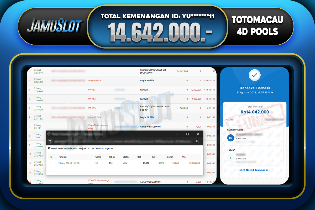 Bukti JP TOTOMACAU 4D POOLS Di Bayar LUNAS Situs JamuSlot Amanah Sebesar Rp.14.642.000,-