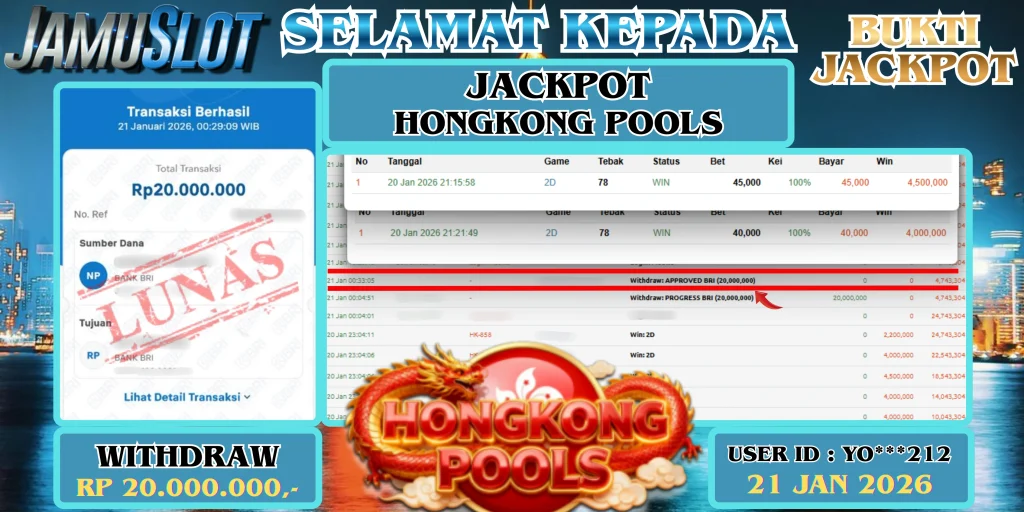 BUKTI PEMBAYARAN KEMENANGAN JP HONGKONG POOLS SEBESAR 20.000.000,- LUNAS