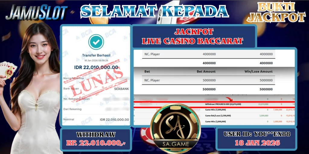 BUKTI PEMBAYARAN KEMENANGAN JP LIVE CASINO BACCARAT SEBESAR 22.010.000,- LUNAS