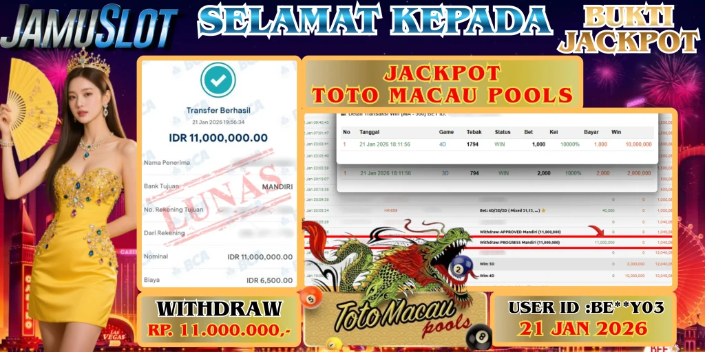 BUKTI PEMBAYARAN KEMENANGAN JP TOTO MACAU POOLS SEBESAR 11.000.000,- LUNAS
