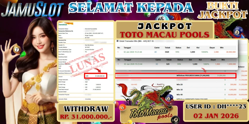 BUKTI PEMBAYARAN KEMENANGAN JP TOTO MACAU POOLS SEBESAR 31.000.000,- LUNAS