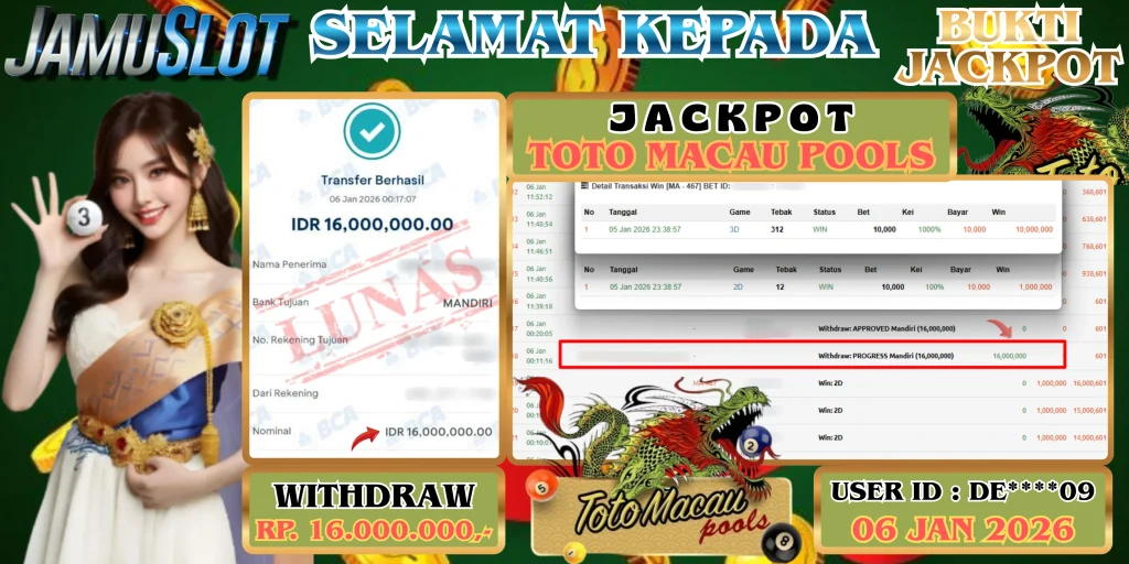 BUKTI PEMBAYARAN KEMENANGAN JP TOTOMACAU POOLS SEBESAR 16.000.000,- LUNAS
