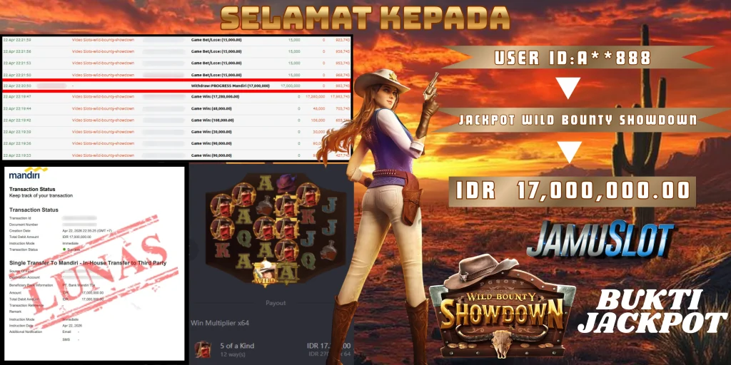 BUKTI PEMBAYARAN KEMENANGAN JP WILD BOUNTY SHOWDOWN 17.000.000,- LUNAS