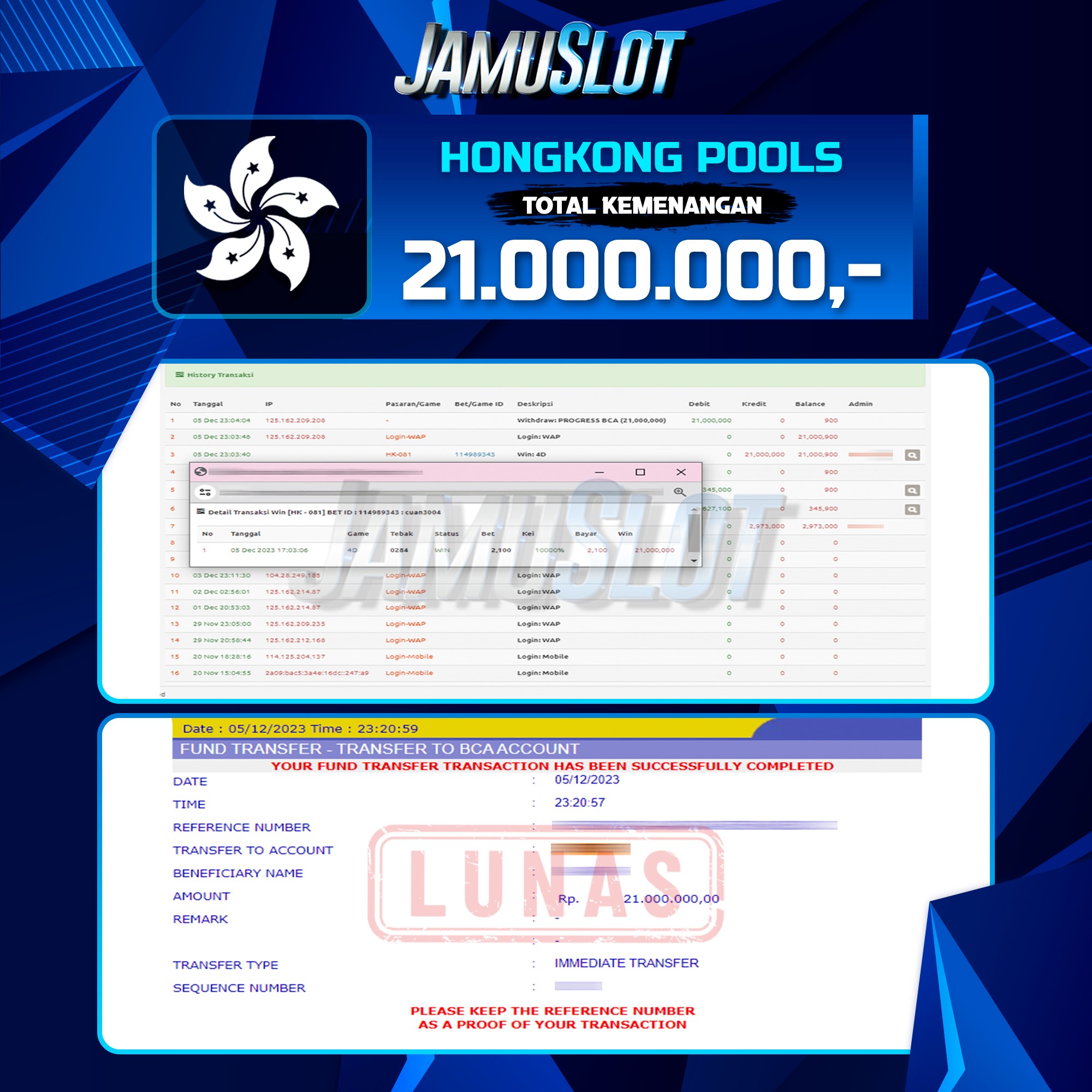 JAMUSLOT : BUKTI PEMBAYARAN KEMENANGAN JP TOGEL HONGKONG SEBESAR 21.000.000,- LUNAS